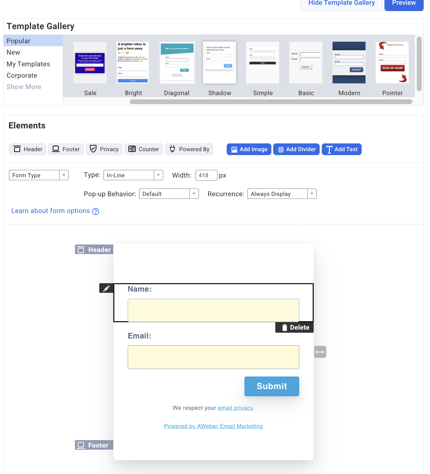 You can use the form editor to delete the Name field if you only want to capture a user's Email. Sometimes it's easier to just capture an email.