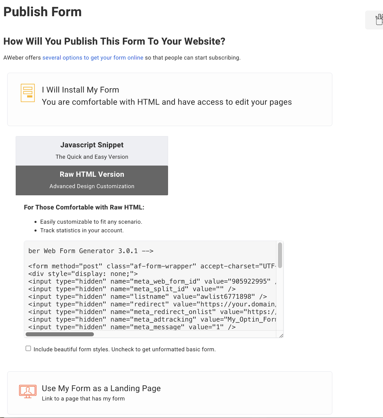 However, if you're planning on customizing the form with your own styles, then click on the Raw HTML Version and uncheck the checkbox to just get the absolutely raw HTML form.