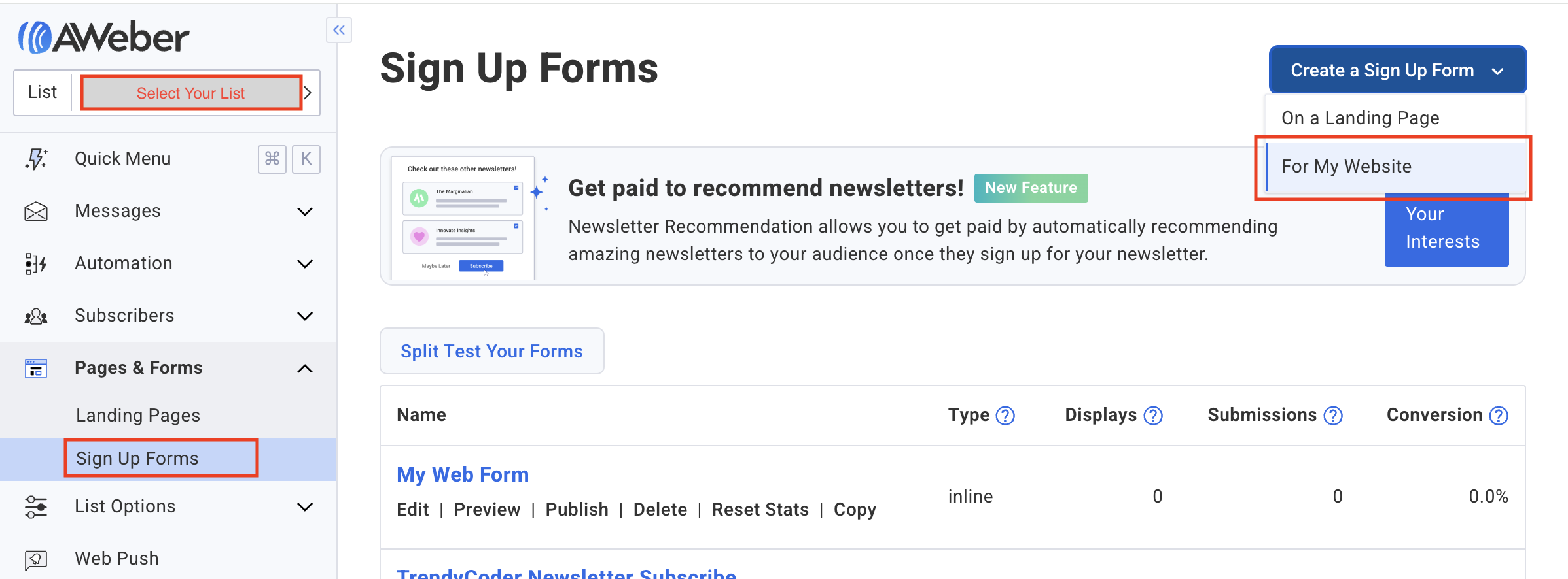 Go to Pages and Forms > Sign Up Forms left menu option. Click on the right, top button Create a Sign Up Form and select the For My Website option.