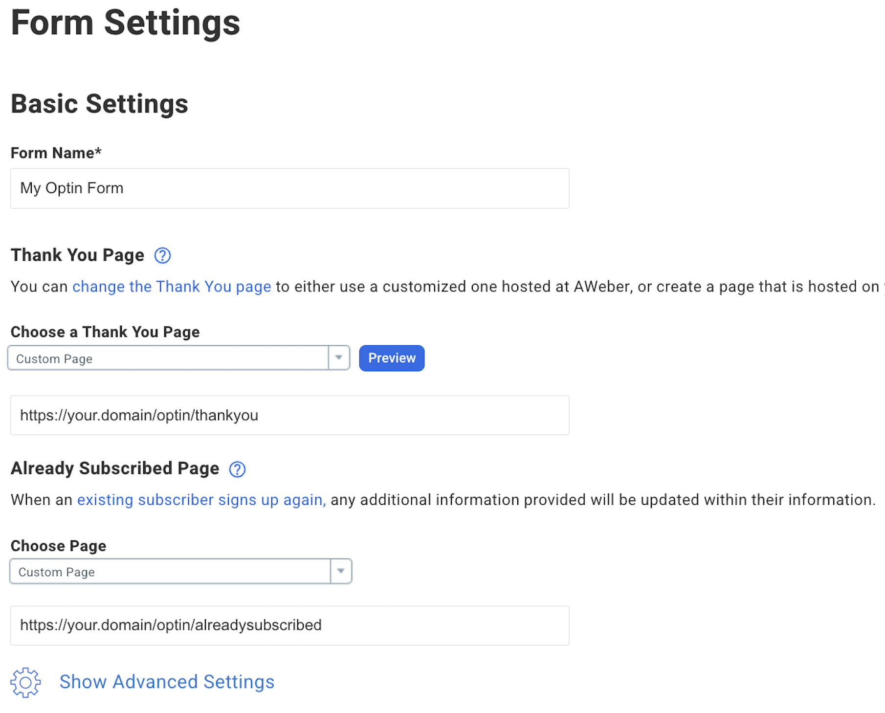 On the Settings tab it will ask for the redirect URLs, which are optional but it's always best to use custom pages using the Custom Page option and provide the page URL's for these pages.