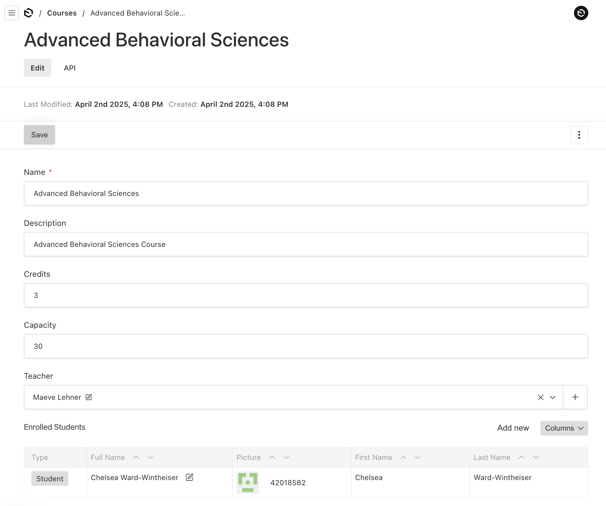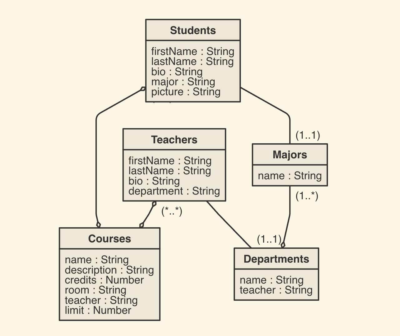 - Courses: Each course can have many students (many-to-many) and only have one assigned teacher to a course (one-to-one).