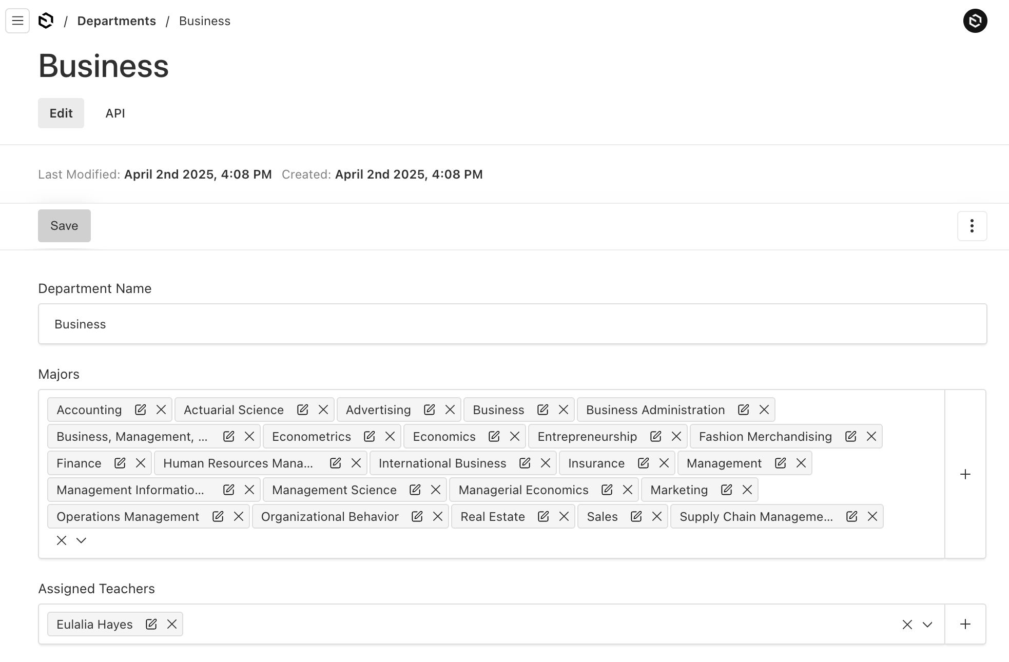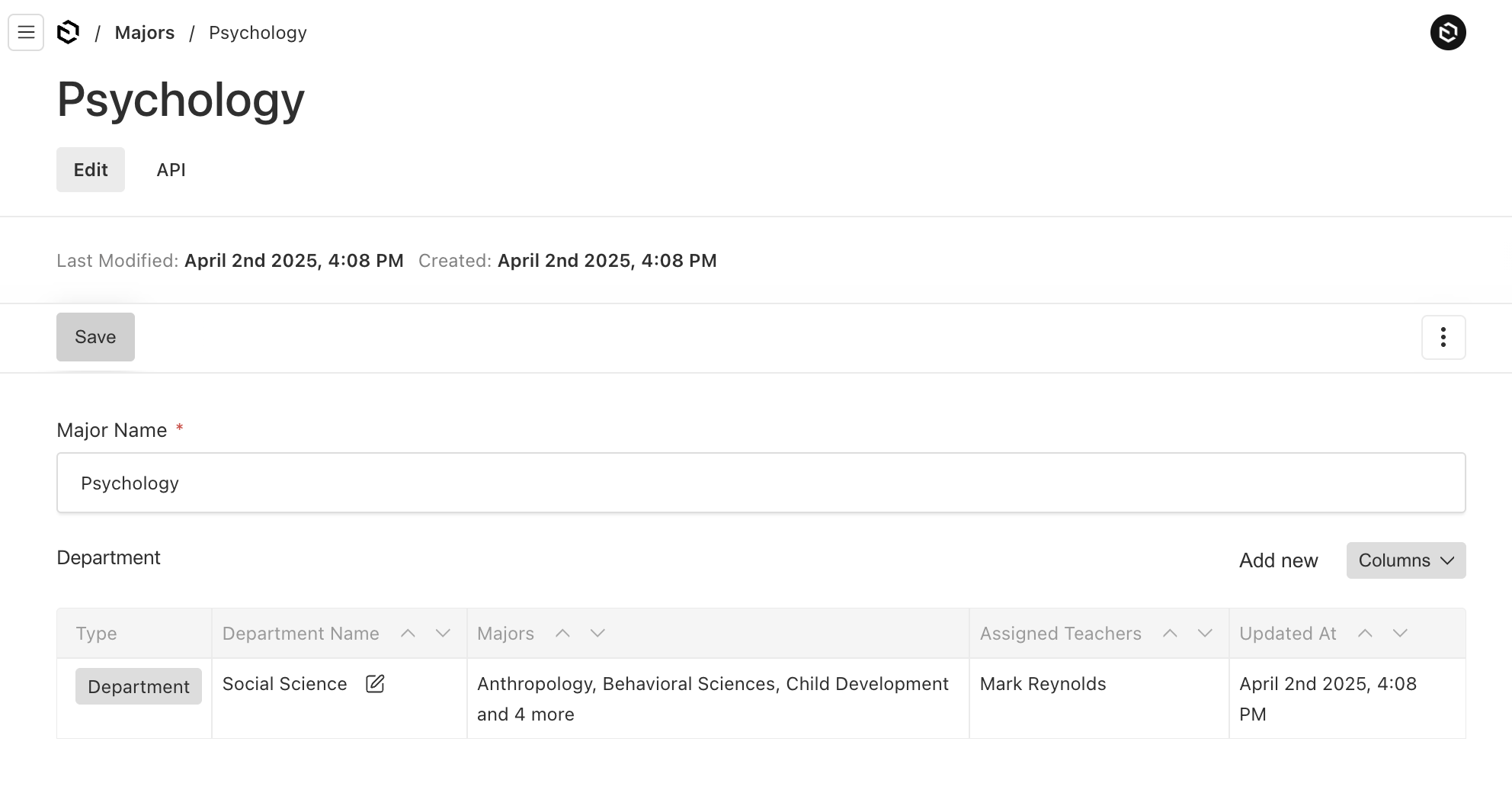 - majors: A relationship field to add and manage majors that will fall under this department.