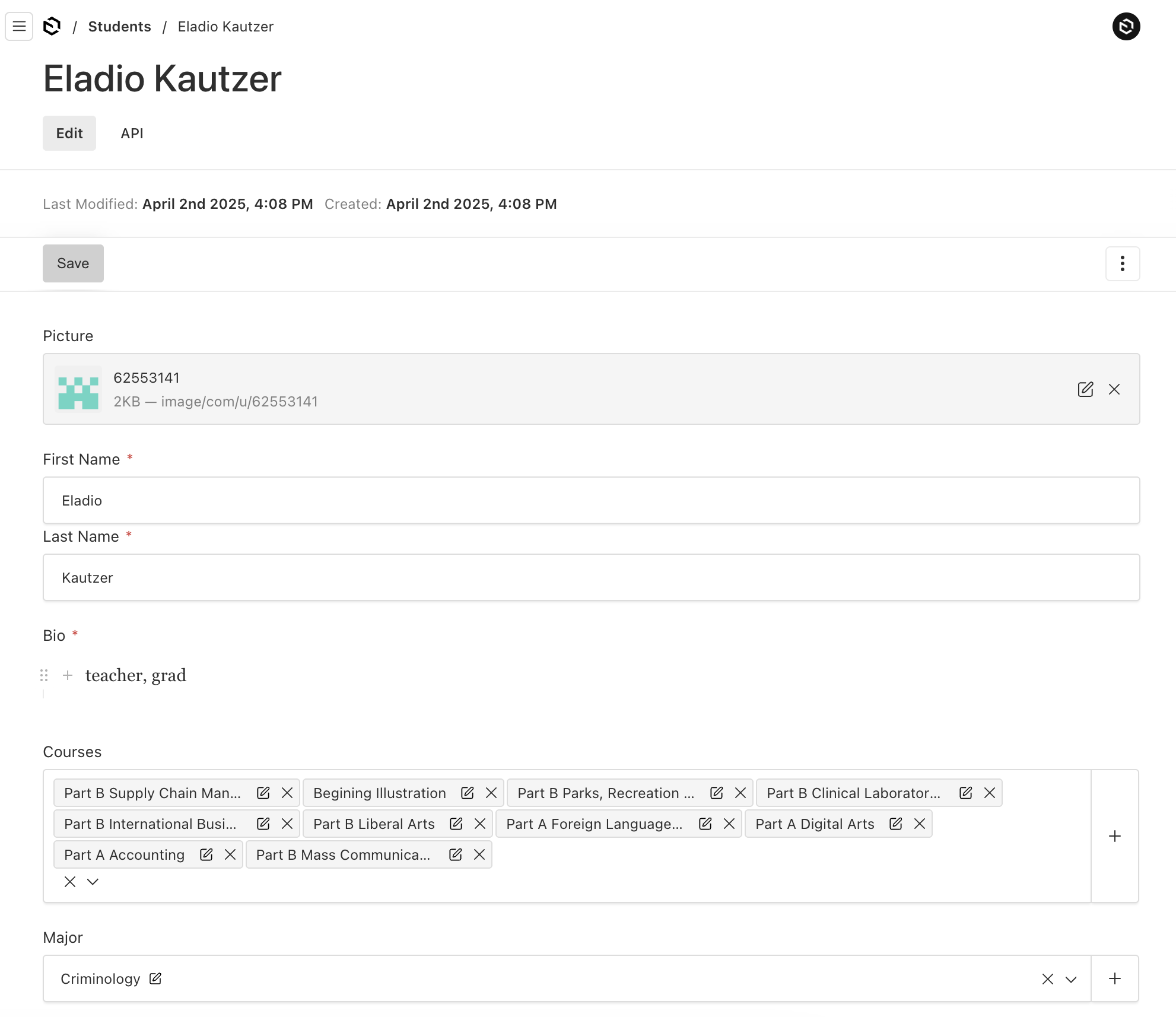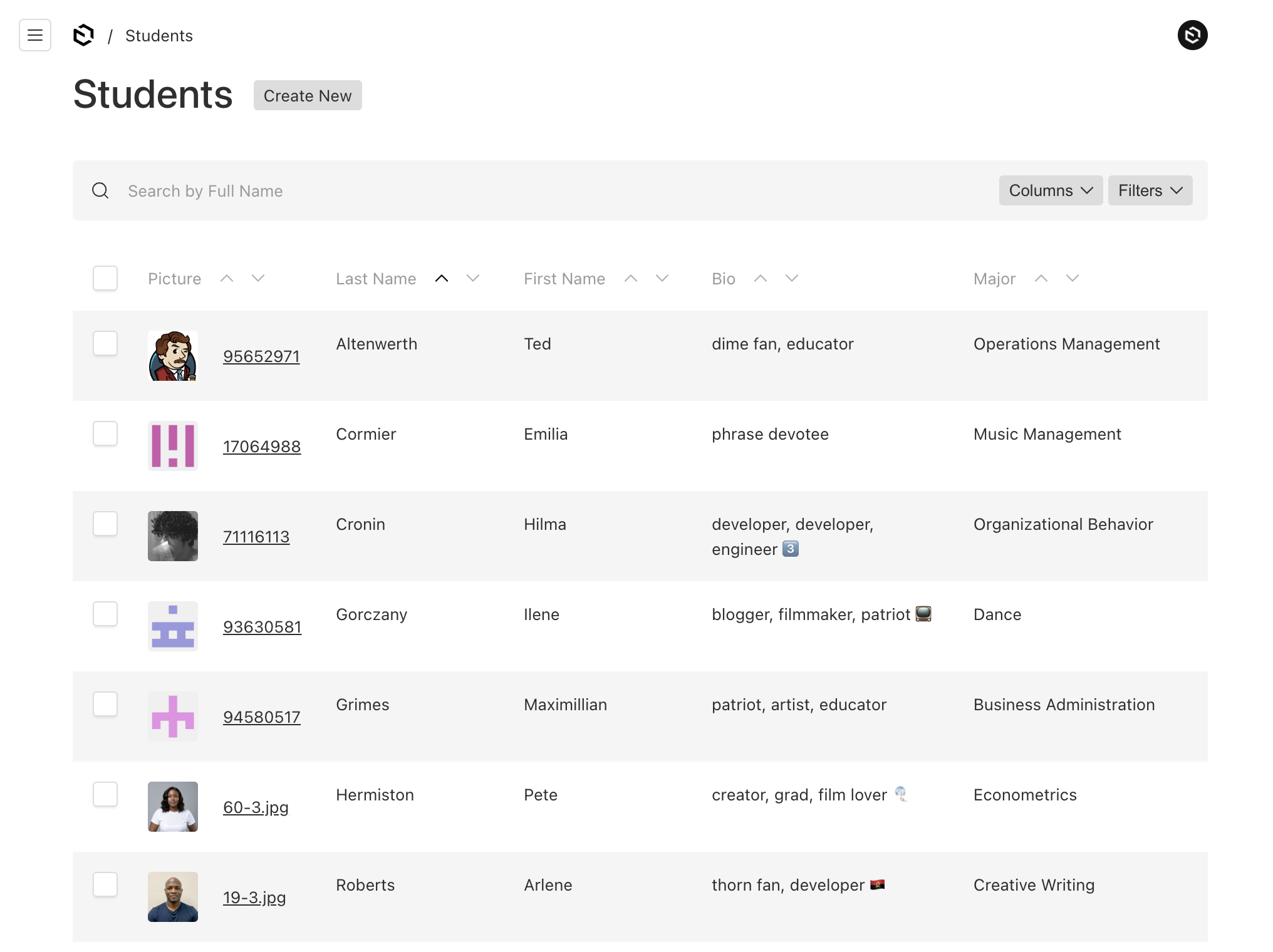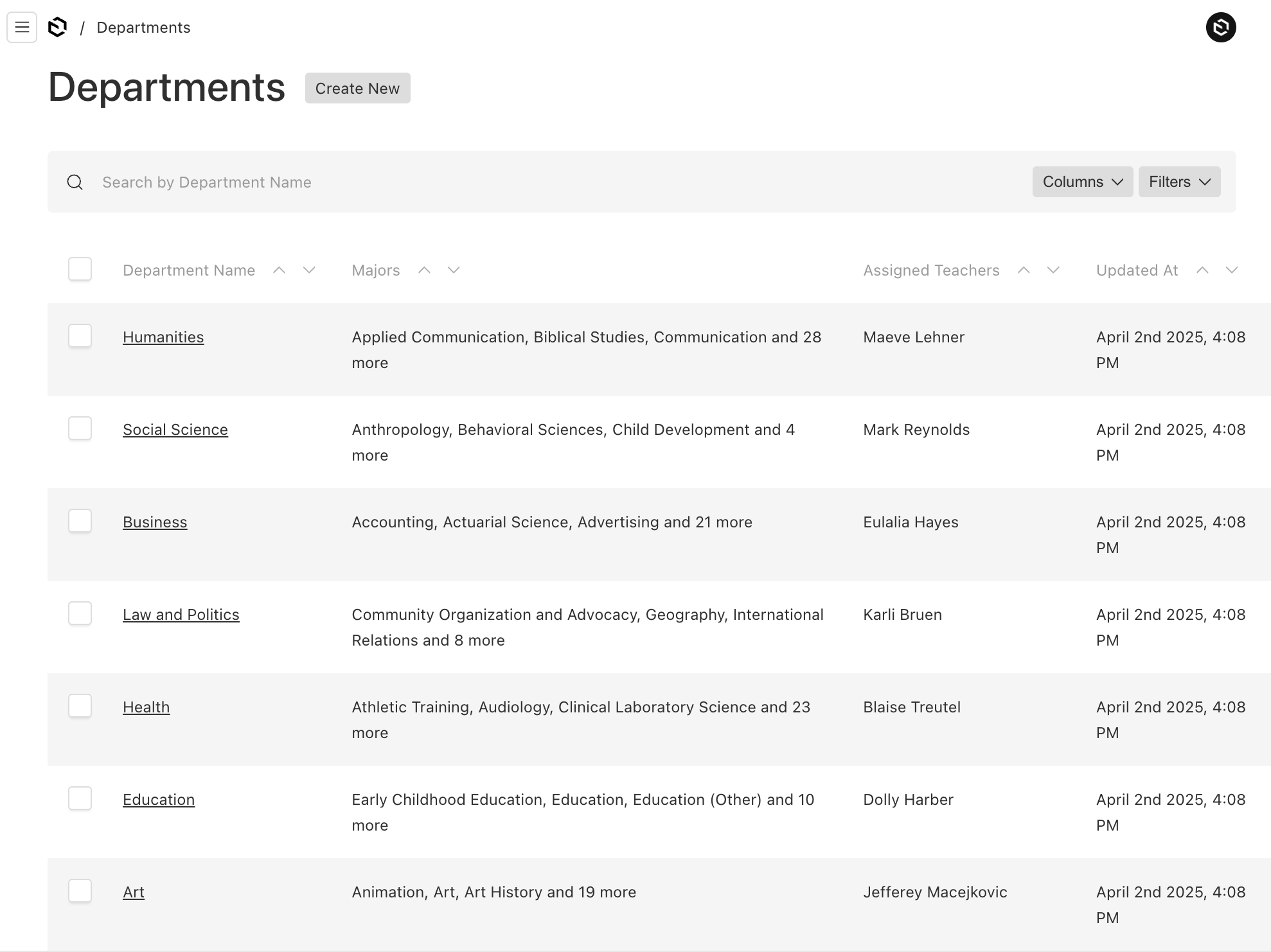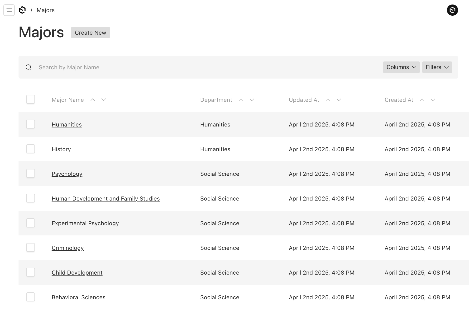 Here's the list page of Majors. Notice the department is visible in the listing for quick reference.